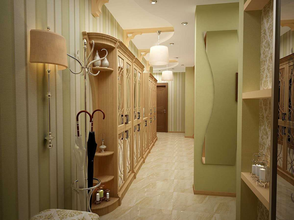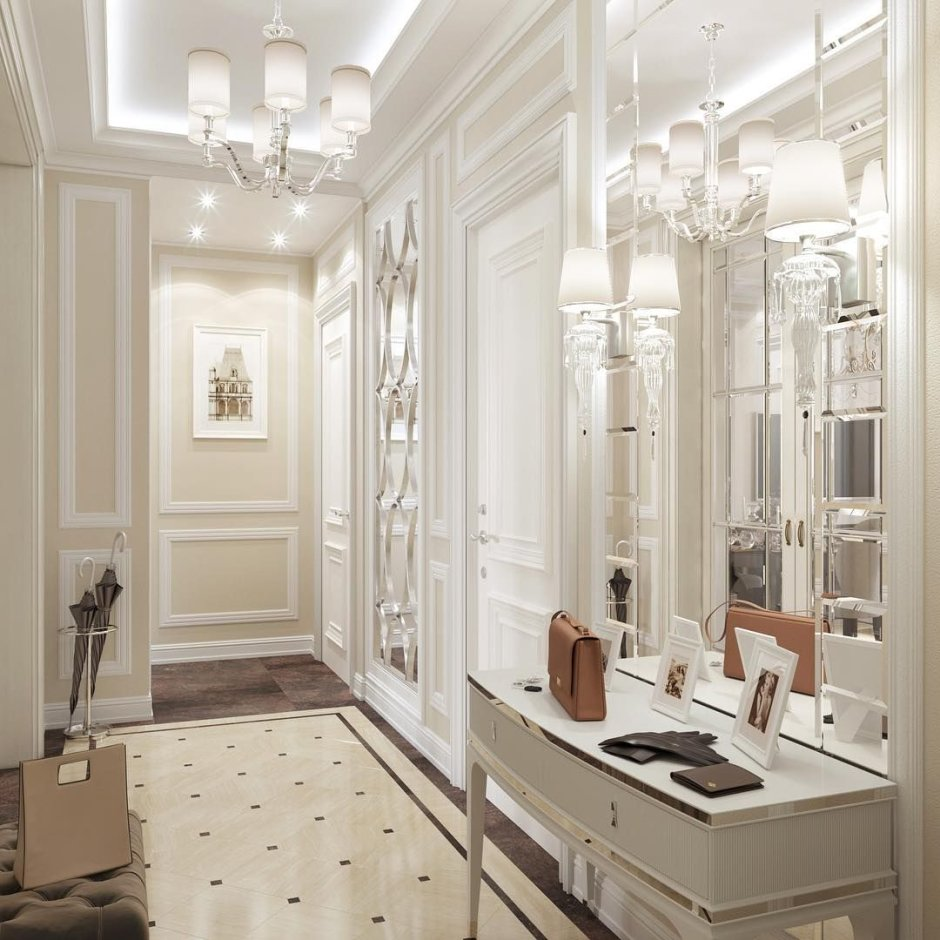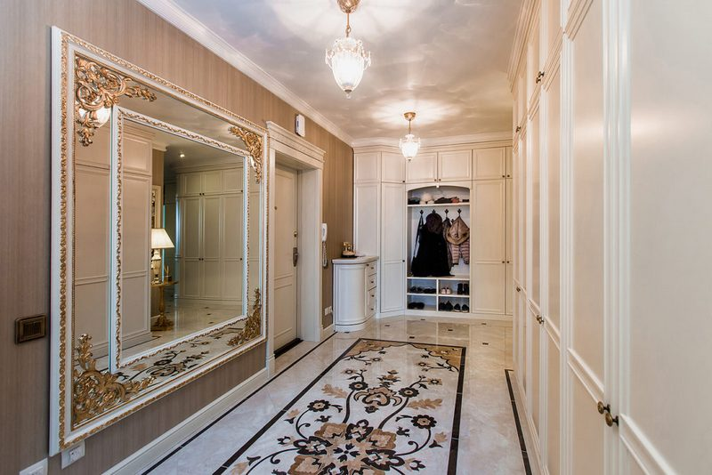 Классикалық стильдегі тар кіреберістің дизайны да танымал. Әсем шкаф-купелер, сәнді жақтаудағы айна және шағын комод кеңістікке сән-салтанат сезімін береді.
