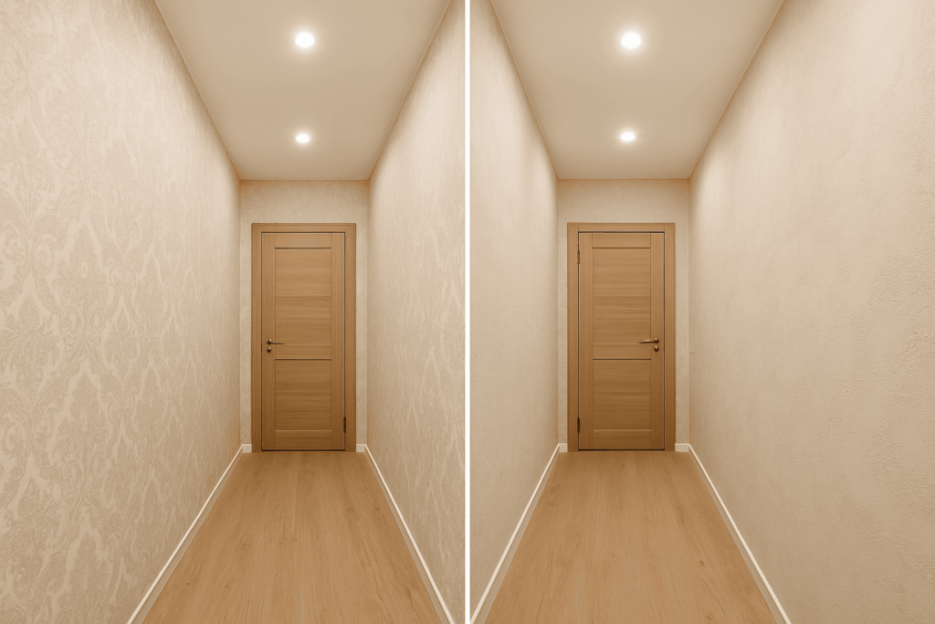 Жауап интерьер стиліне байланысты. Ұсақ өрнегі бар тұсқағаз кеңістікке тереңдік береді, ал көлденең өрнек енін арттырып көрсетеді. Ашық реңктегі декоративті сылақ, әсіресе жеңіл жылтыры немесе текстурасы бар түрі, тар кіреберісті көзбен кеңейтіп, оны заманауи етіп көрсетеді.
