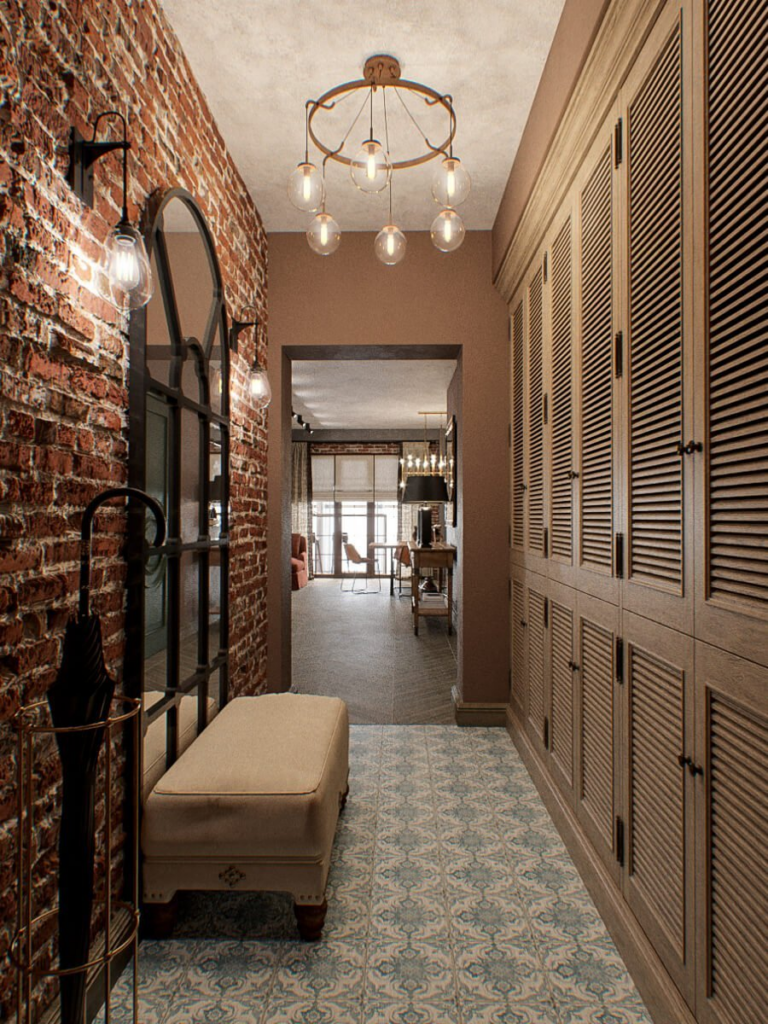 Индустриялық эстетиканы ұнататындар, әрине, лофт стилін таңдайды. Ерекше металл ілгіштер, өңделмеген ағаштан жасалған сөрелер және былғары банкеткалар тар кіреберістің дизайнына өте жақсы үйлеседі.