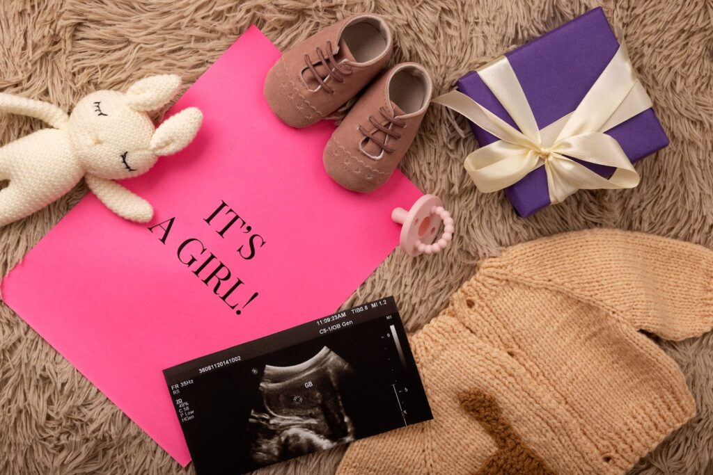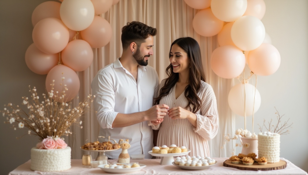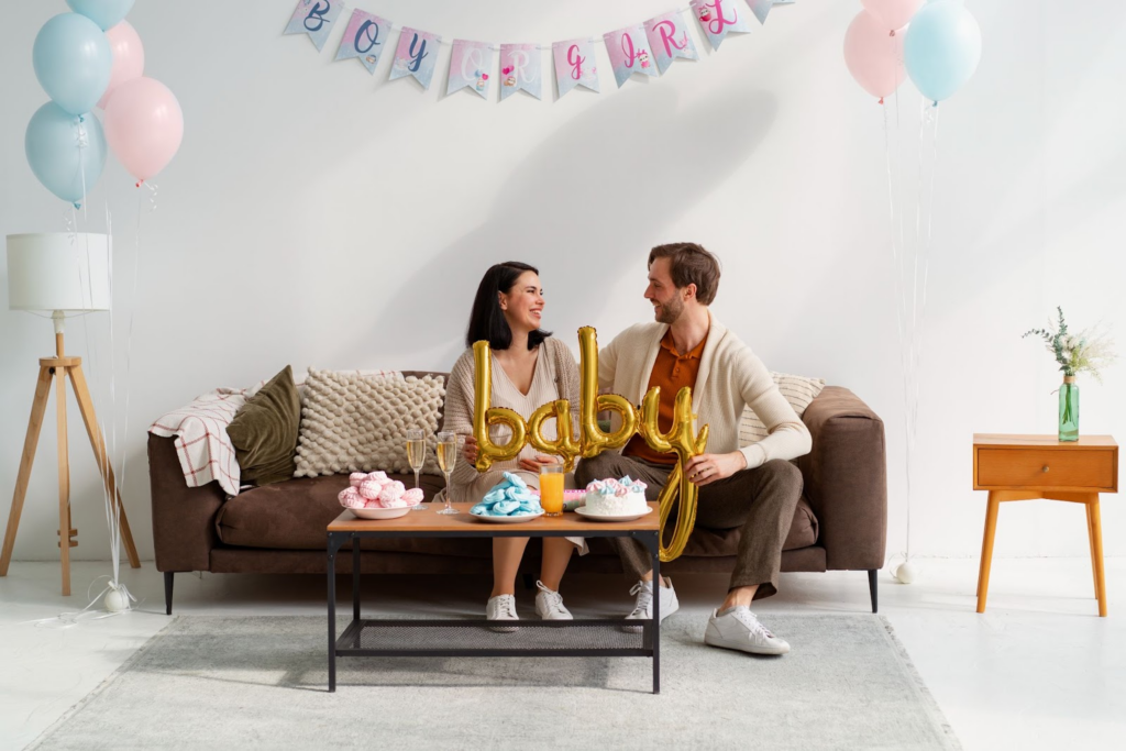 Болашақ ата-аналар есіктерін ашқан кезде қонақтар ішіндегі жарқын безендіруді көреді: сәбидің жынысына сәйкес түстегі киімдер, ойыншықтар, аксессуарлар мен декор. Қыз бала болса — нәзік көйлектер, плюш ойыншықтар, бантиктер мен жұмсақ пледтер, ал ұл бала болса — шағын костюмдер, машинкалар, кепкалар және тақырыптық аксессуарлар.