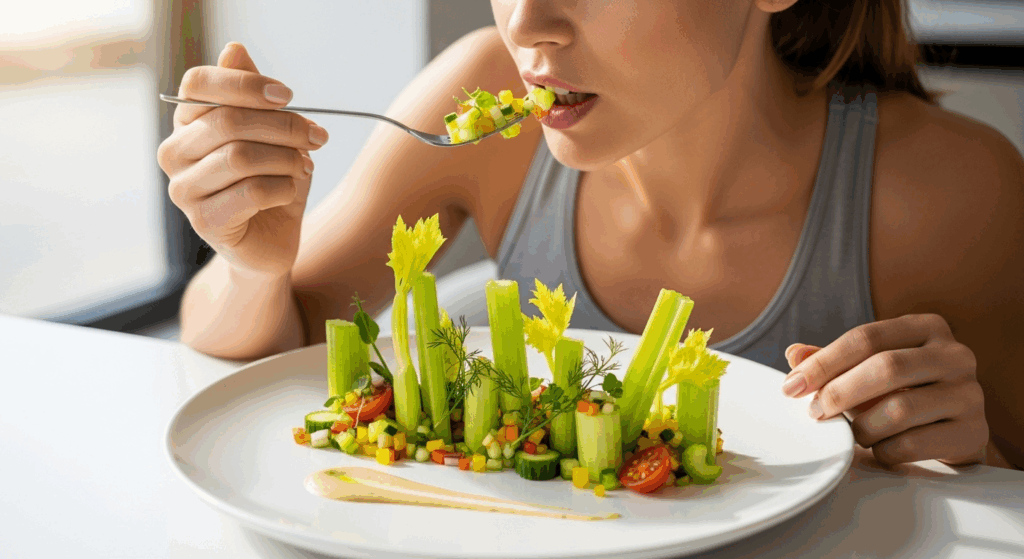 Сельдерей помогает формировать сбалансированное питание. Если заменить им часть калорийных закусок или добавить в салаты и овощные блюда, общий суточный рацион становится легче и разнообразнее. Со временем это способствует постепенному снижению веса и более комфортному самочувствию без жестких ограничений.